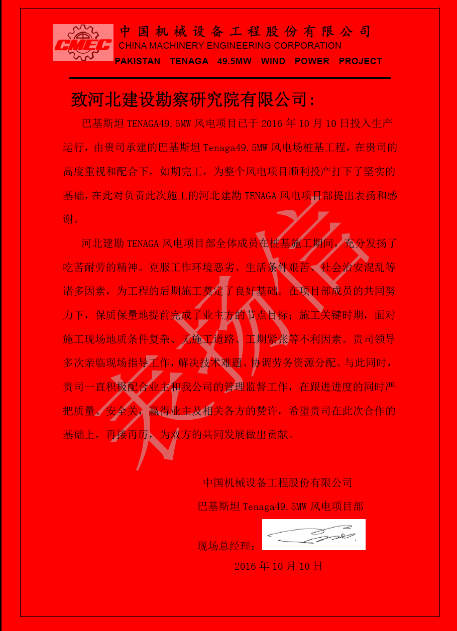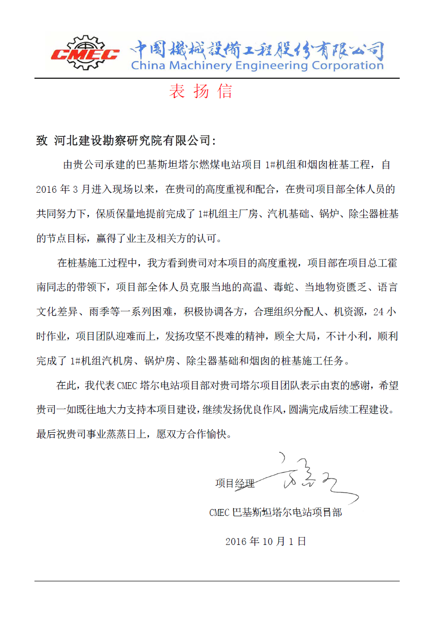 由我公司承建的巴基斯坦塔爾燃煤電站項(xiàng)目1#機(jī)組和煙囪樁基工程和巴基斯坦Tenaga49.5MW風(fēng)電項(xiàng)目,項(xiàng)目部全體人員在項(xiàng)目總工霍南的帶領(lǐng)下,克服工作環(huán)境惡劣、生活條件艱苦等一系列困難,積極協(xié)調(diào)各方,合理組織分配資源,順利完成階段施工任務(wù)。近日,總包方中國機(jī)械設(shè)備工程股份有限公司(CMEC)向我公司發(fā)來感謝信,對(duì)我公司兩個(gè)項(xiàng)目部團(tuán)隊(duì)表示由衷的感謝,并希望我們繼續(xù)發(fā)揚(yáng)優(yōu)良作風(fēng),圓滿完成后續(xù)工程建設(shè)。