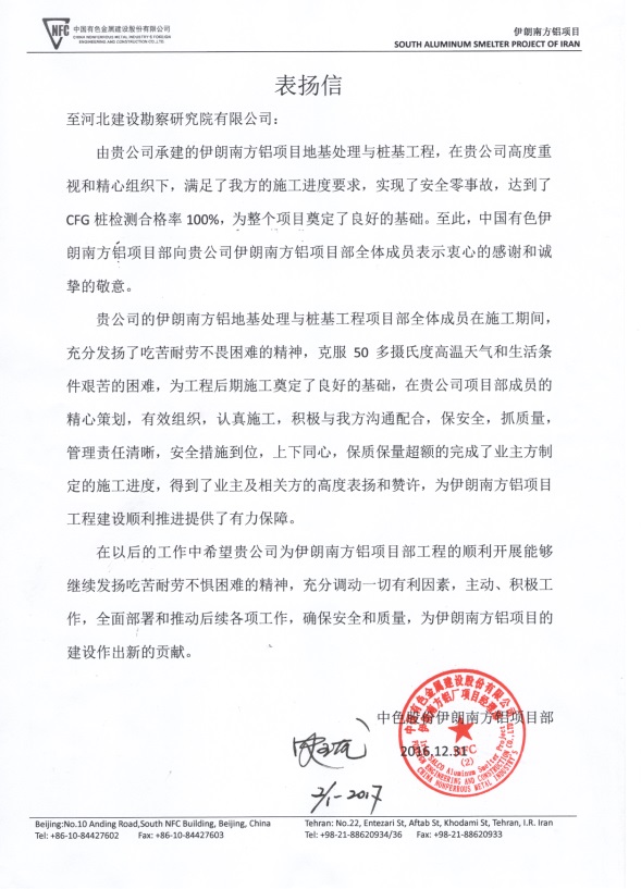 2016年12月31日,公司收到中色股份伊朗南方鋁項(xiàng)目發(fā)來(lái)的表?yè)P(yáng)信。由我公司承建的伊朗南方鋁項(xiàng)目地基處理與樁基工程,在我公司的高度重視和精心組織下,滿足了甲方的施工進(jìn)度要求,實(shí)現(xiàn)了安全零事故,達(dá)到了CFG樁檢測(cè)合格率100%,保質(zhì)保量超額完成了業(yè)主方制定的施工進(jìn)度,得到了業(yè)主及相關(guān)方的高度表?yè)P(yáng)和贊許。