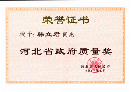 我公司獲得了由河北省人民政府頒發(fā)的“2016年河北省政府質(zhì)量獎”組織提名獎;公司董事長韓立君同志榮獲“河北省政府質(zhì)量獎”個人獎。省委領(lǐng)導(dǎo)為董事長頒發(fā)了獲獎證書和獎杯。