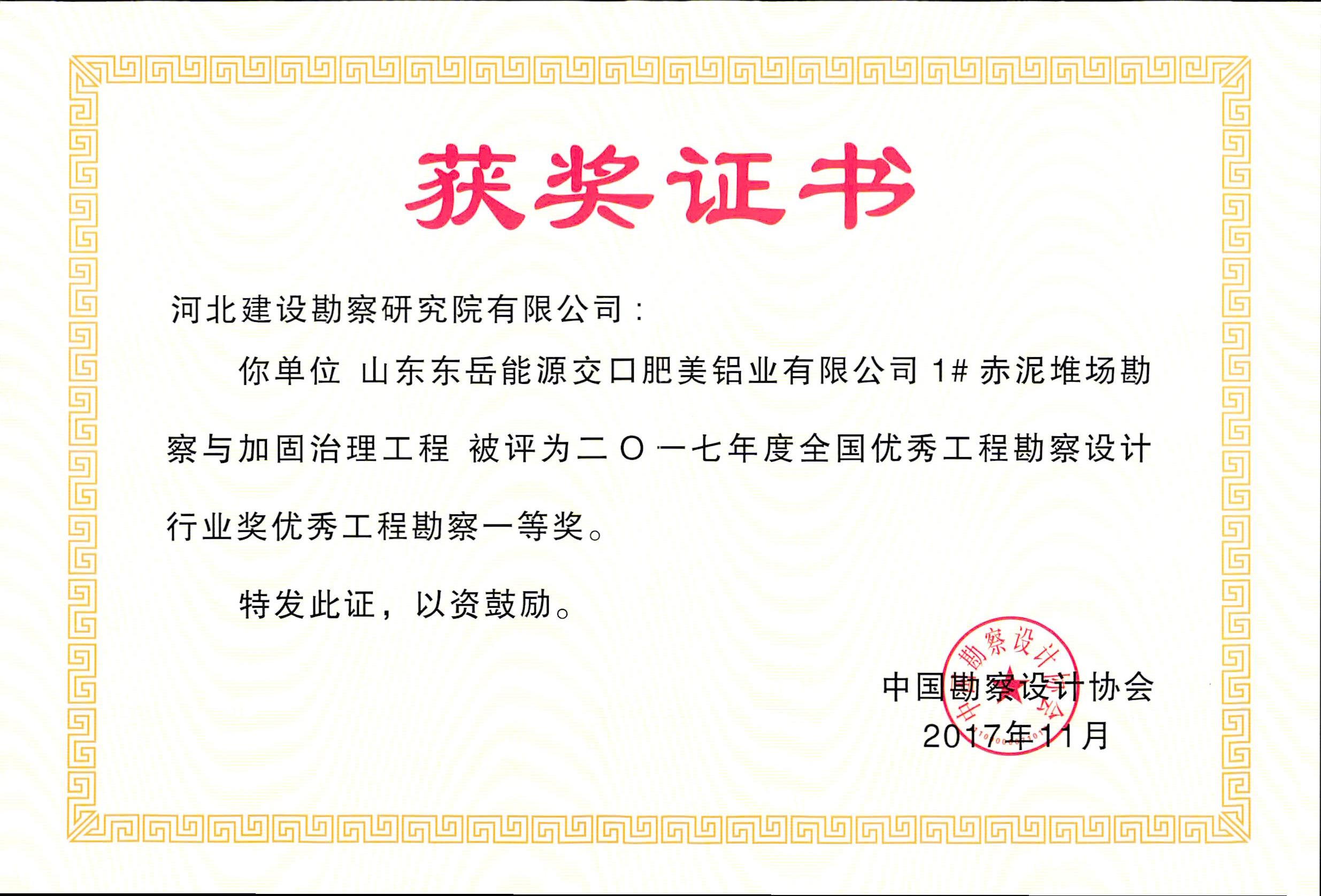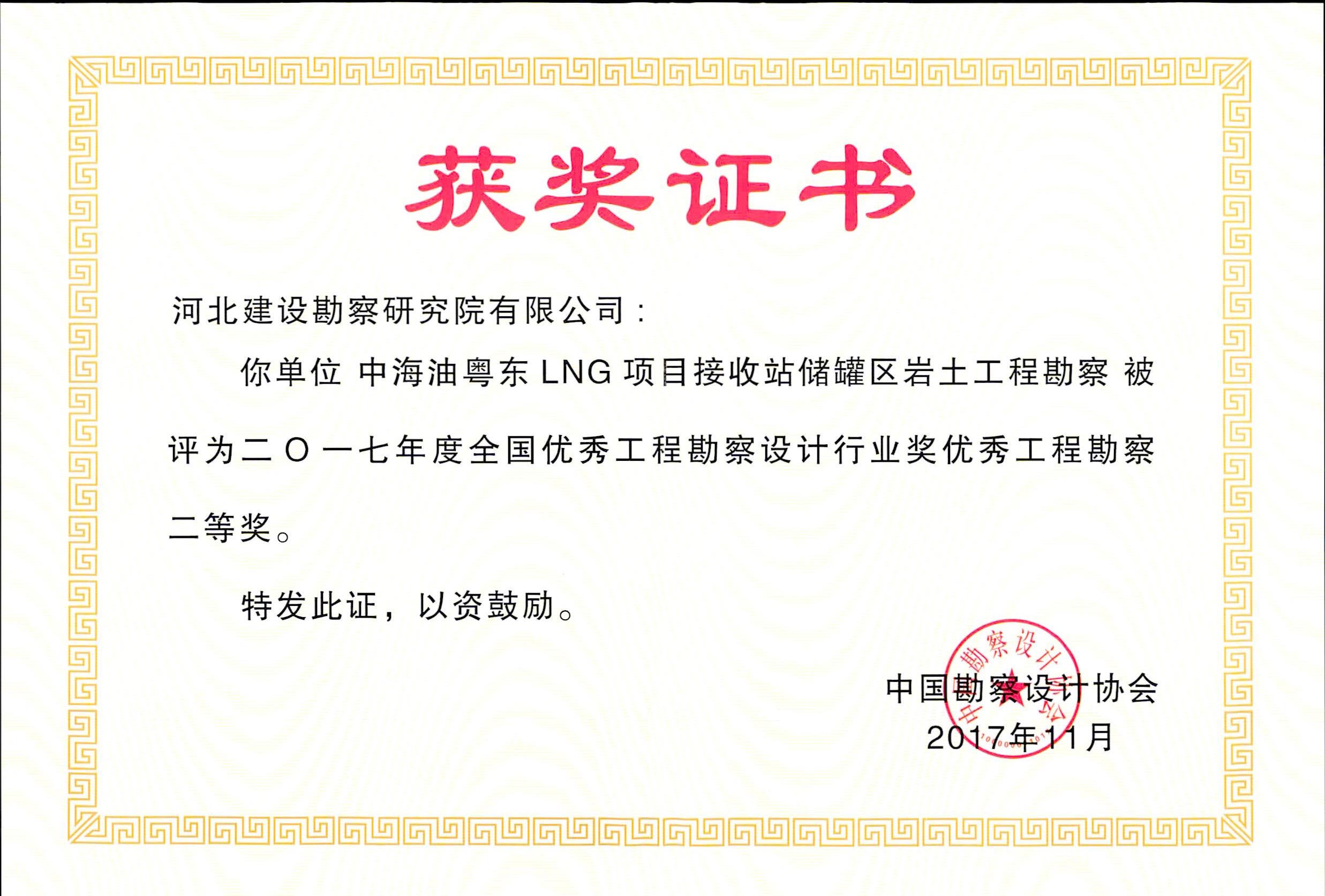 根據中國勘察設計協會2017年11月29日發布的中設協字【2017】85號文件《關于公布2017年度全國優秀工程勘察設計行業獎評選結果的通知》,我公司兩項工程獲優秀工程勘察獎。其中,山東東岳能源交口肥美鋁業有限公司1#赤泥堆場勘察與加固治理工程榮獲優秀工程勘察一等獎,中海油粵東LNG項目接收站儲罐區巖土工程勘察榮獲優秀工程勘察二等獎。