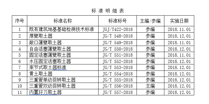 近日,國家住房和城鄉(xiāng)建設(shè)部發(fā)布公告,批準(zhǔn)我公司主編的建筑工業(yè)行業(yè)產(chǎn)品標(biāo)準(zhǔn)《三重管雙動(dòng)回轉(zhuǎn)取土器 JG∕T 549-2018》、參編的《既有建筑地基基礎(chǔ)檢測(cè)技術(shù)標(biāo)準(zhǔn)JGJ/T422-2018》等共十一項(xiàng)標(biāo)準(zhǔn),正式發(fā)布實(shí)施。