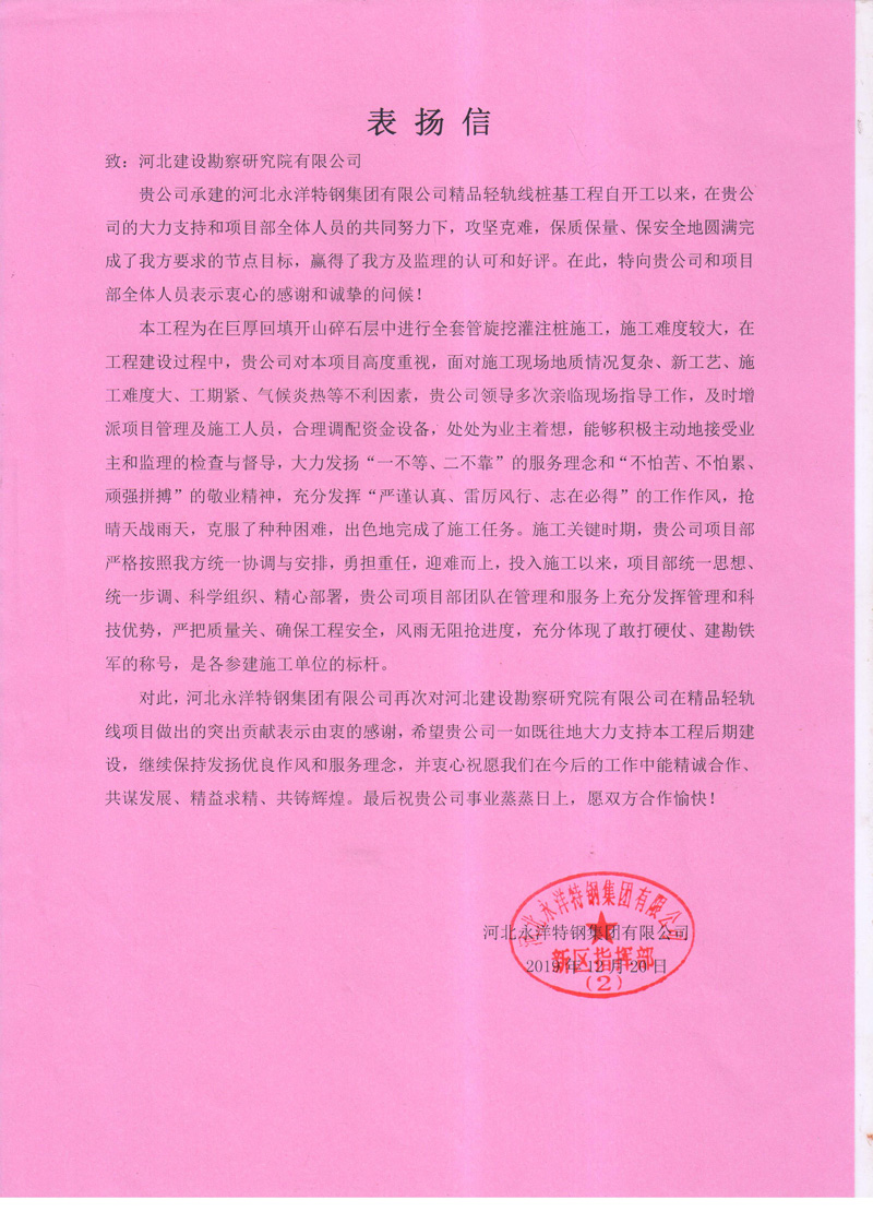 近日,我公司河北永洋特鋼集團(tuán)有限公司精品輕軌線樁基工程收到河北永洋特鋼集團(tuán)有限公司的表?yè)P(yáng)信。項(xiàng)目部全體員工大力發(fā)揚(yáng)“一不等、二不靠”的服務(wù)理念和“不怕苦、不怕累、頑強(qiáng)拼搏”的敬業(yè)精神,充分發(fā)揮“嚴(yán)謹(jǐn)認(rèn)真、雷厲風(fēng)行、志在必得”的工作作風(fēng),搶晴天戰(zhàn)雨天,克服了種種困難,出色地完成了施工任務(wù)。甲方對(duì)項(xiàng)目部全體員工的辛勤付出,給予了高度認(rèn)可和評(píng)價(jià),并為后續(xù)雙方的合作奠定了良好基礎(chǔ)。并衷心祝愿我們?cè)诮窈蟮墓ぷ髦心芫\(chéng)合作、共謀發(fā)展、精益求精、共鑄輝煌。