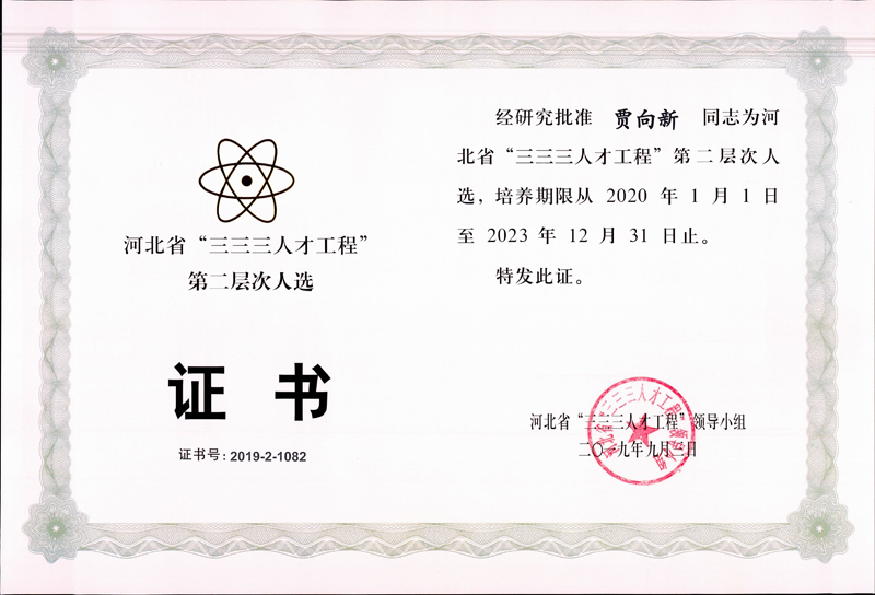 經公司申報、石家莊市人力資源和社會保障局推薦,河北省“三三三人才工程”領導小組批準,我公司賈向新同志榮獲2019年度河北省“三三三人才工程”第二層次人選。