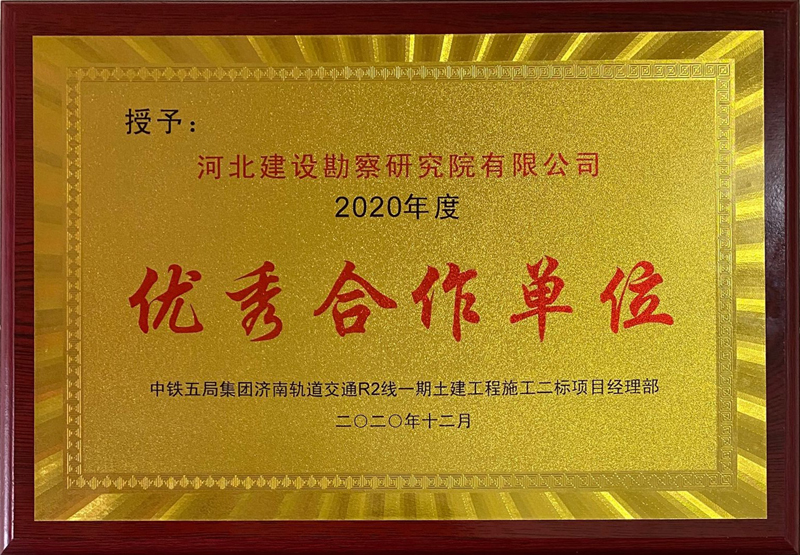 近日,由我公司承接的濟南軌道交通R2線施工監測項目,榮獲中鐵五局集團濟南軌道交通R2線一期工程項目土建二標經理部 “2020年度優秀合作單位”和“郝迪培2020年度優秀班組長”兩項榮譽獎牌。
