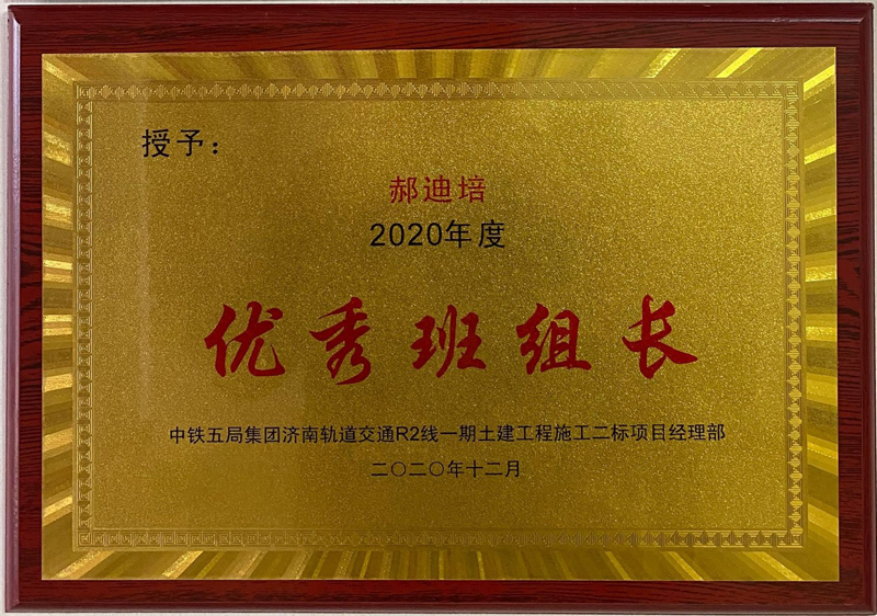 為此中鐵五局集團濟南軌道交通R2線一期工程項目土建二標經理部特授予我公司“2020年度優秀合作單位”和“郝迪培2020年度優秀班組長” 兩項榮譽獎牌,希望我公司一如既往、繼續發揚優良工作作風,并希望在今后的工作中,雙方精誠合作,共謀發展新篇章!