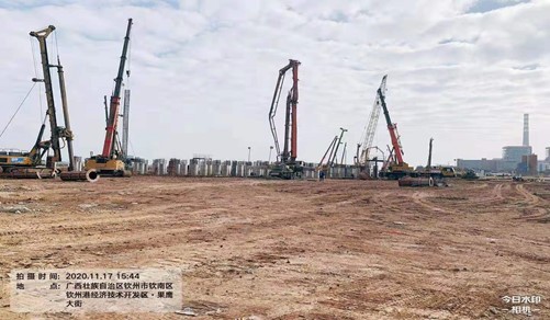 本工程位于廣西欽州港。受廣西華誼新材料有限公司委托,我公司承擔本項目樁基施工。采用自有的“樁柱一體”施工工法、長臂挖掘機振動下設長護筒、標準化泥漿池、快速機械連接、旋挖鉆機入巖等施工工藝和新方法共計完成4093根灌注樁,PHC管樁1759根。