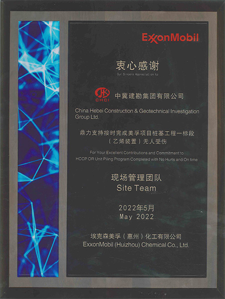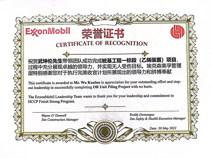 5月30日,埃克森美孚(惠州)化工有限公司召開2022年工作表彰大會,我公司參建的惠州美孚乙烯一期樁基工程項目部,在參建的30余家施工單位中以優異的成績,榮獲“優秀管理團隊”稱號,生產設備科科長兼項目經理武坤倫榮獲 “卓越領導力”個人榮譽證書,項目部每位員工都收到了業主頒發的獎品。