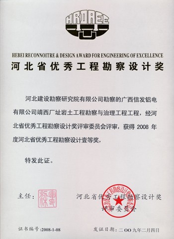 廣西信發(fā)鋁電有限公司靖西廠址巖土工程勘察與治理工程獲河北省優(yōu)秀工程勘察設(shè)計(jì)一等獎(jiǎng)。