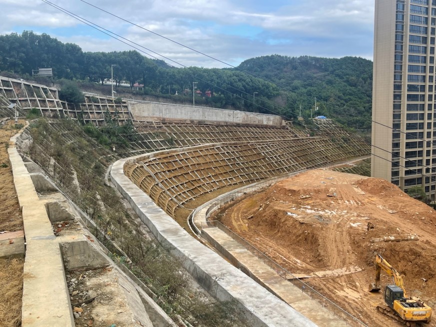 本工程位于浙江省永嘉縣甌北街道烏山路嶼塘山桃源陵園路段,本工程為大型地質災害治理施工項目,主要施工內容包括邊坡削坡、人工挖孔樁、鉆孔灌注樁、微型樁、錨桿格構、毛石擋墻、板肋式擋墻、扶壁擋墻、盲溝、截排水溝、深部排水孔、錨索、護欄欄桿、樁間擋板、平臺硬化、噴坡綠化、路面修復等。