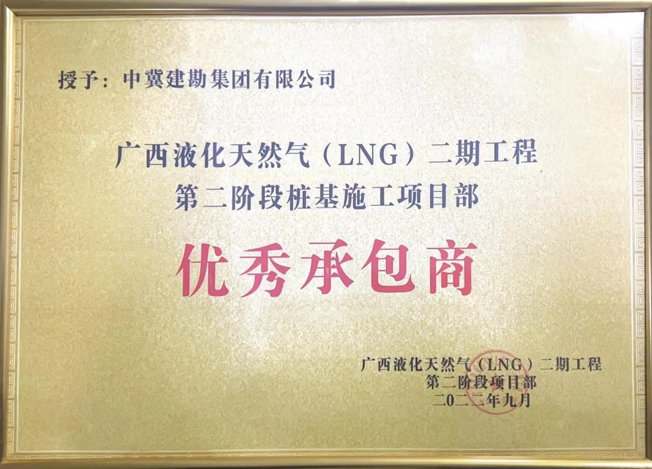 廣西液化天然氣LNG項目5#6#儲罐樁基項目是國家管網(wǎng)集團北海液化天然氣有限責任公司非常重視的項目。我公司自2022年04月承接了廣西LNG二期項目儲罐樁基施工,本項目于2022年5月20日開始,7月11日完成。從施工開始,本項目24小時晝夜不間斷施工,為保障工程高質(zhì)量高效率完成,施工期間,建設單位、PMC單位、監(jiān)理單位及施工單位配備了充足的管理人員及施工人員,在疫情肆虐,天氣炎熱,雨季臺風等一系列困難重重之下,廣西LNG項目部全體員工保持高度的工作熱情,克服一切艱難險阻,順利完成了樁基施工全部任務。樁基檢測結果全部為Ⅰ類樁,保質(zhì)保量的完成了各個里程碑節(jié)點目標,榮獲國家管網(wǎng)集團北海液化天然氣有限責任公司廣西北海LNG二期項目部的表揚信及優(yōu)秀優(yōu)秀承包商集體榮譽。