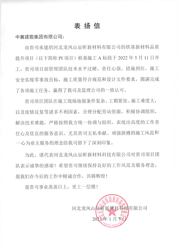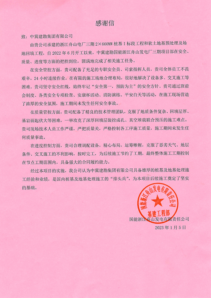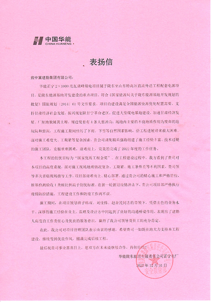我公司華能甘肅正寧電廠二期工程項目部收到業(yè)主方華能隴東能源公司正寧電廠發(fā)來的表揚信,施工期間,在項目領導的帶領下,憑借出色的業(yè)務水平、深厚的施工經(jīng)驗在業(yè)主、監(jiān)理及設計方中間起到了良好的溝通橋梁作用。本工程的創(chuàng)優(yōu)目標為“國家優(yōu)質(zhì)工程金獎”,我單位負責的B標段樁基檢測驗收I類樁比例高于創(chuàng)優(yōu)標準。在新一輪新冠疫情沖擊下,項目部嚴格執(zhí)行疫情防控措施,工程建設工作和防疫工作兩不誤表現(xiàn)出了建勘人高度的工作責任心及優(yōu)良的服務意識,贏得了華能隴東能源公司領導及員工的充分肯定。