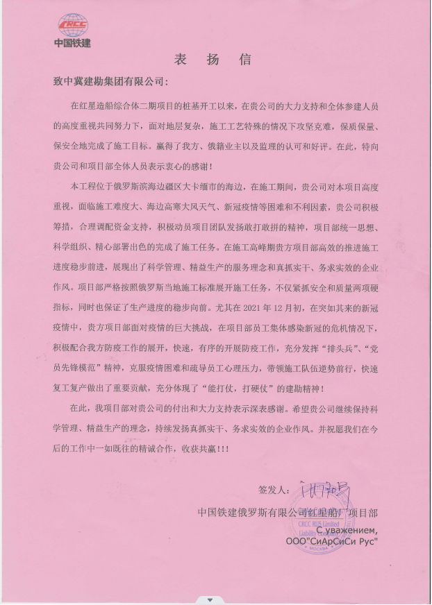 俄羅斯海參崴紅星造船綜合體(二期)項目,收到中國鐵建俄羅斯紅星船廠項目部的表揚信,施工期間,在項目領導的帶領下,項目部統(tǒng)一思想、科學組織,經(jīng)過305天的奮戰(zhàn),項目部完成了質(zhì)量安全零事故,保質(zhì)保量促進生產(chǎn)的任務目標。我公司負責的302、303、304廠房樁基檢測驗收全部合格。在施工高峰期克服了 新冠疫情、高寒天氣、俄烏戰(zhàn)爭影響等諸多困難和不利因素,采取24小時不間斷施工,積極調(diào)配合理高效的推進施工進度穩(wěn)步前進。尤其在突如其來的新冠疫情中,項目部面對疫情的巨大挑戰(zhàn),積極采取措施,配合防疫工作的展開,快速,有序的開展隔離工作,安撫感染人員恐慌情緒。這種科學防疫、積極組織為后期快速復工復產(chǎn)做出了重要貢獻,得到了總包單位的充分肯定和表揚。