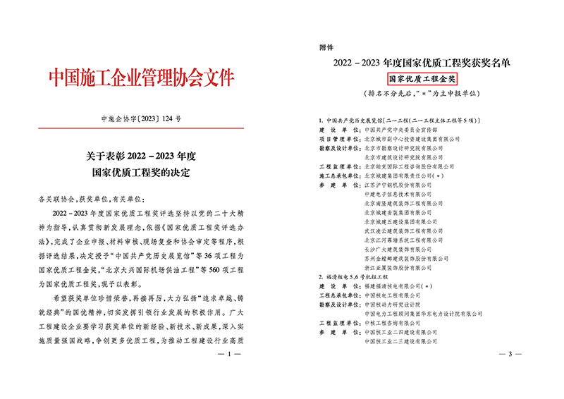 12月9日,中國施工企業(yè)管理協(xié)會發(fā)布了《關(guān)于表彰2022-2023年度國家優(yōu)質(zhì)工程獎的決定》(中施企協(xié)字[2023]124號),我公司參與建設(shè)的3項(xiàng)工程獲得國家優(yōu)質(zhì)工程獎,其中1項(xiàng)工程獲得國家優(yōu)質(zhì)工程金獎。