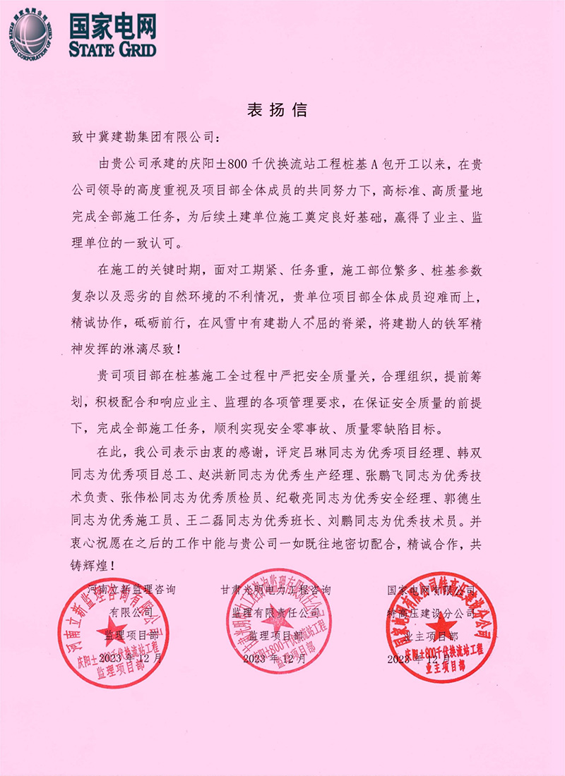 公司收到了國家電網慶陽±800千伏換流站工程由業主國家電網和監理單位河南立新及甘肅光明的聯合表揚信,表揚信中說在我公司領導的高度重視及項目部全體成員的共同努力下,高標準、高質量地完成施工任務,為后續土建單位施工奠定良好基礎,贏得了業主、監理單位的一致認可。在施工的關鍵時期,我單位項目部全體成員迎難而上,精誠協作,砥礪前行,在風雪中有建勘人不屈的脊梁,將建勘人的鐵軍精神發揮的淋漓盡致!
