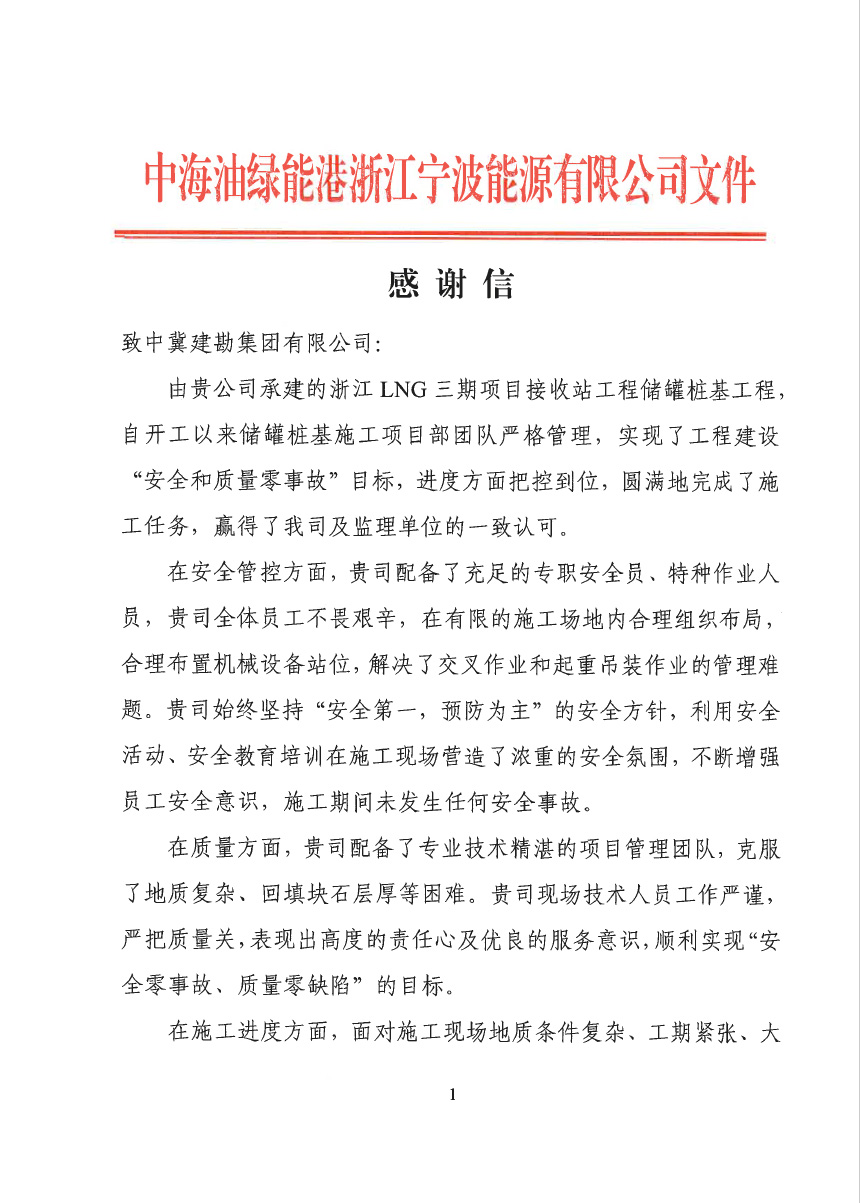 浙江LNG三期接收站儲罐項目是國家和省重點能源項目,工期、質量、安全標準要求高,開工前期準備工作多,在集團公司及各級領導的幫助下,項目部全體員工迎難而上,團結協作,精心組織,于2023年3月4日儲罐樁基正式開工,并于2023年6月18日完工。施工期間多次收到中海油綠能港浙江寧波能源有限公司頒發的各種優秀獎項,也得到了業主方的高度認可,也為我公司后續在承接中海油工程施工奠定了良好的基礎。