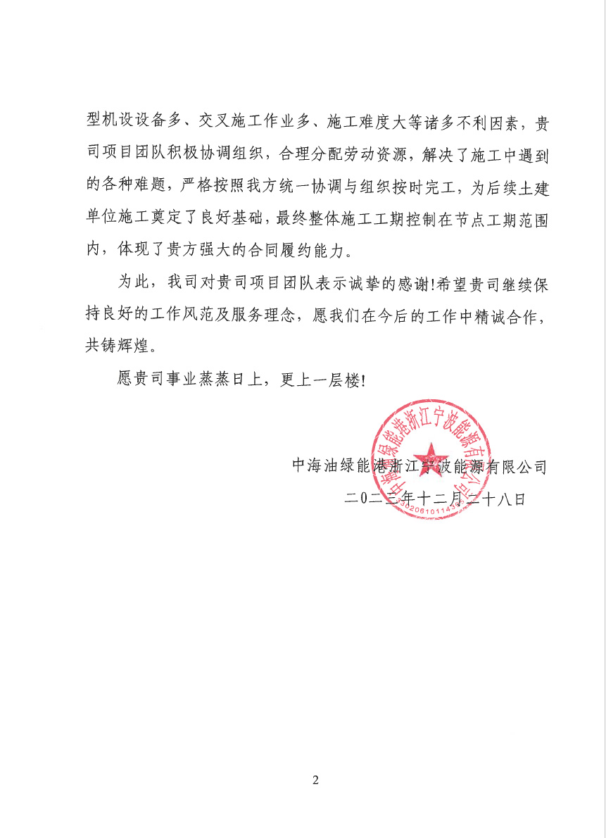 中化泉州石化有限公司為我公司發來了新年問候信,信中中化泉州石化有限公司肯定了我公司對中化泉州石化有限公司青蘭山預留地新建原油儲罐項目建設的重視;看到了我公司及項目施工人員為項目的辛勤付出;并期望在新的一年里加強合作,再創新業績。