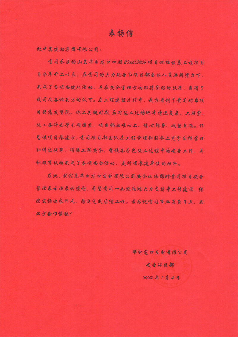 華電龍口發電有限公司四期項目2號機組于2023年12月17日20時04分順利完成168小時滿負荷試運行。工程建設期間,完成了各項安健環活動,并在安全管理方面取得良好的效果,贏得了業主方認可。我公司人員嚴格遵守我公司規章制度,急業主之所急,想業主之所想,統籌協調資源,展現了良好的精神風貌、履約能力、企業品牌形象。為此,業主特向我公司各級領導、項目團隊在工程施工過程中給予的支持和幫助表示由衷感謝。