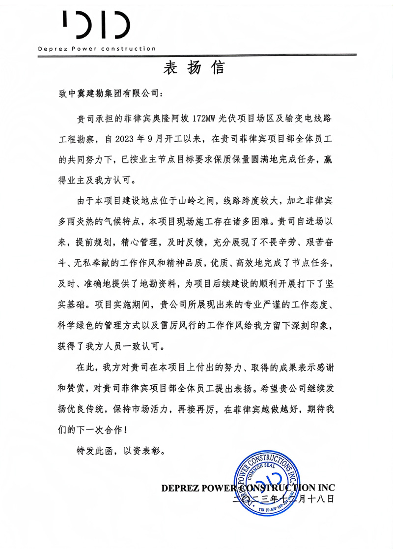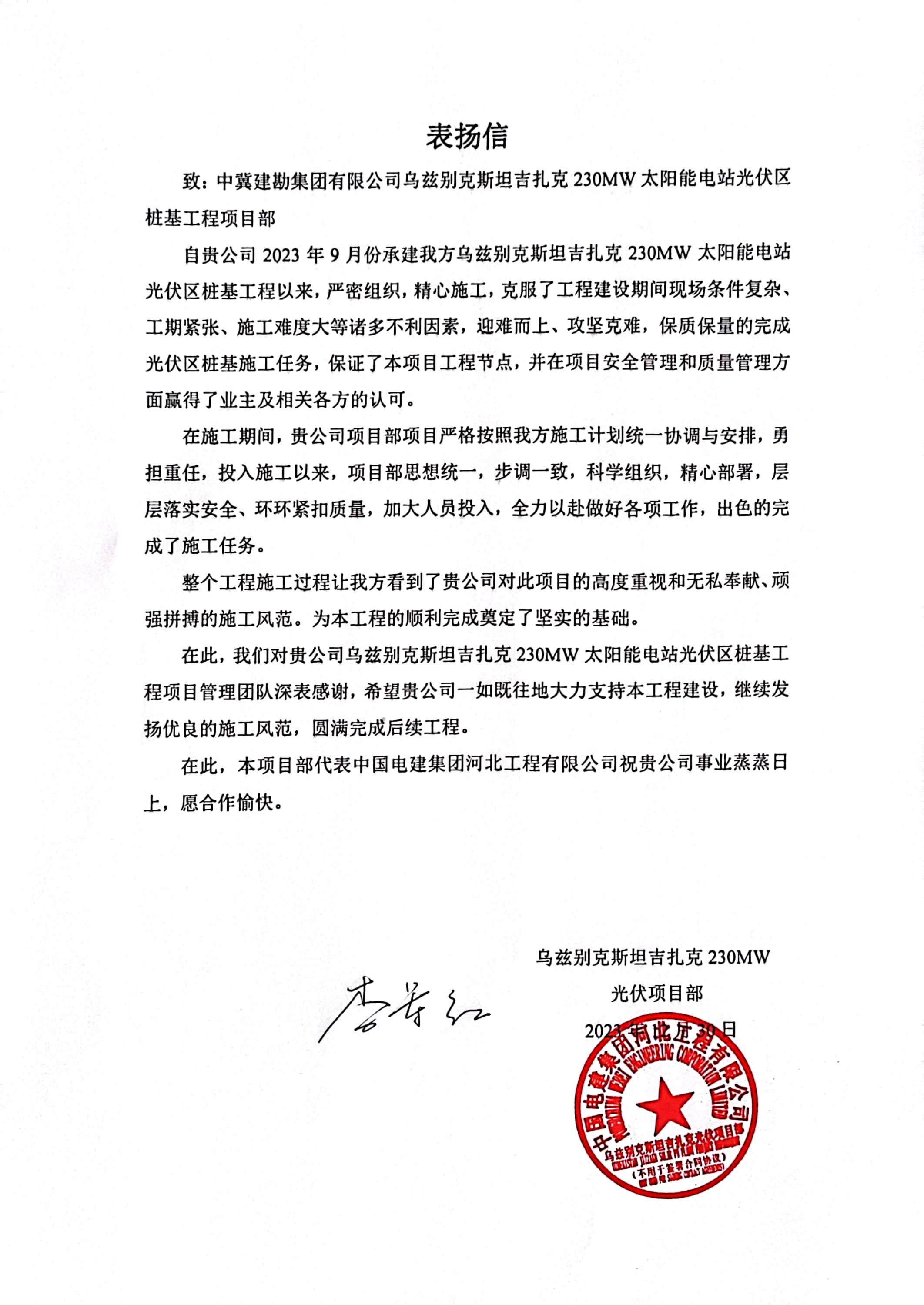 中國電建集團河北工程有限公司發來的表揚信,對在烏茲別克斯坦吉扎克230MW太陽能電站光伏項目施工期間,項目部思想統一,科學組織,精心部署,層層落實安全、環環緊扣質量,全力以赴做好各項工作的奮斗精神,給予了高度評價和感謝。