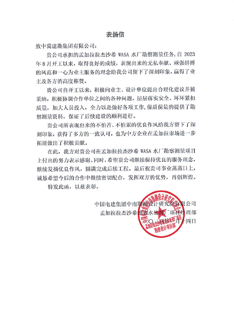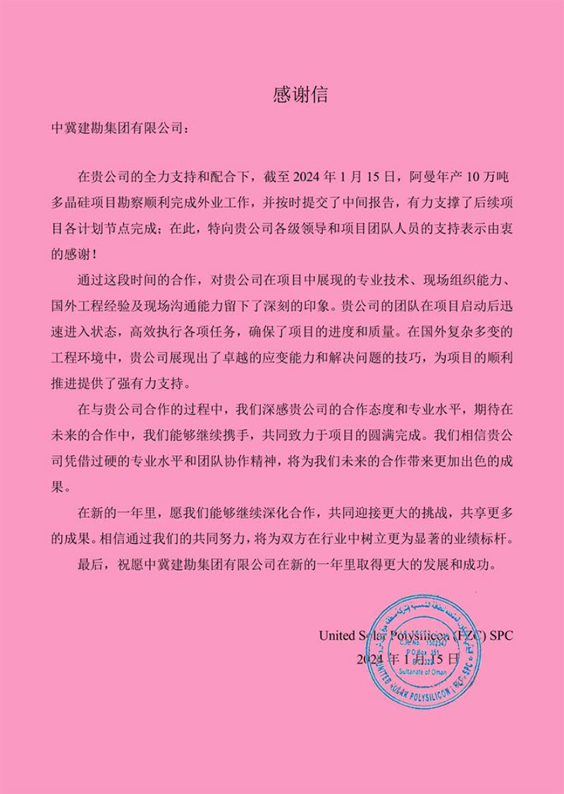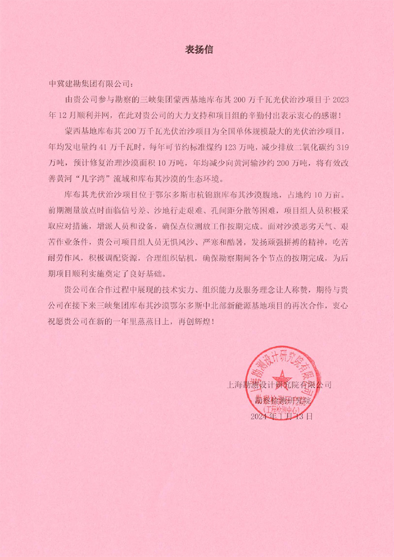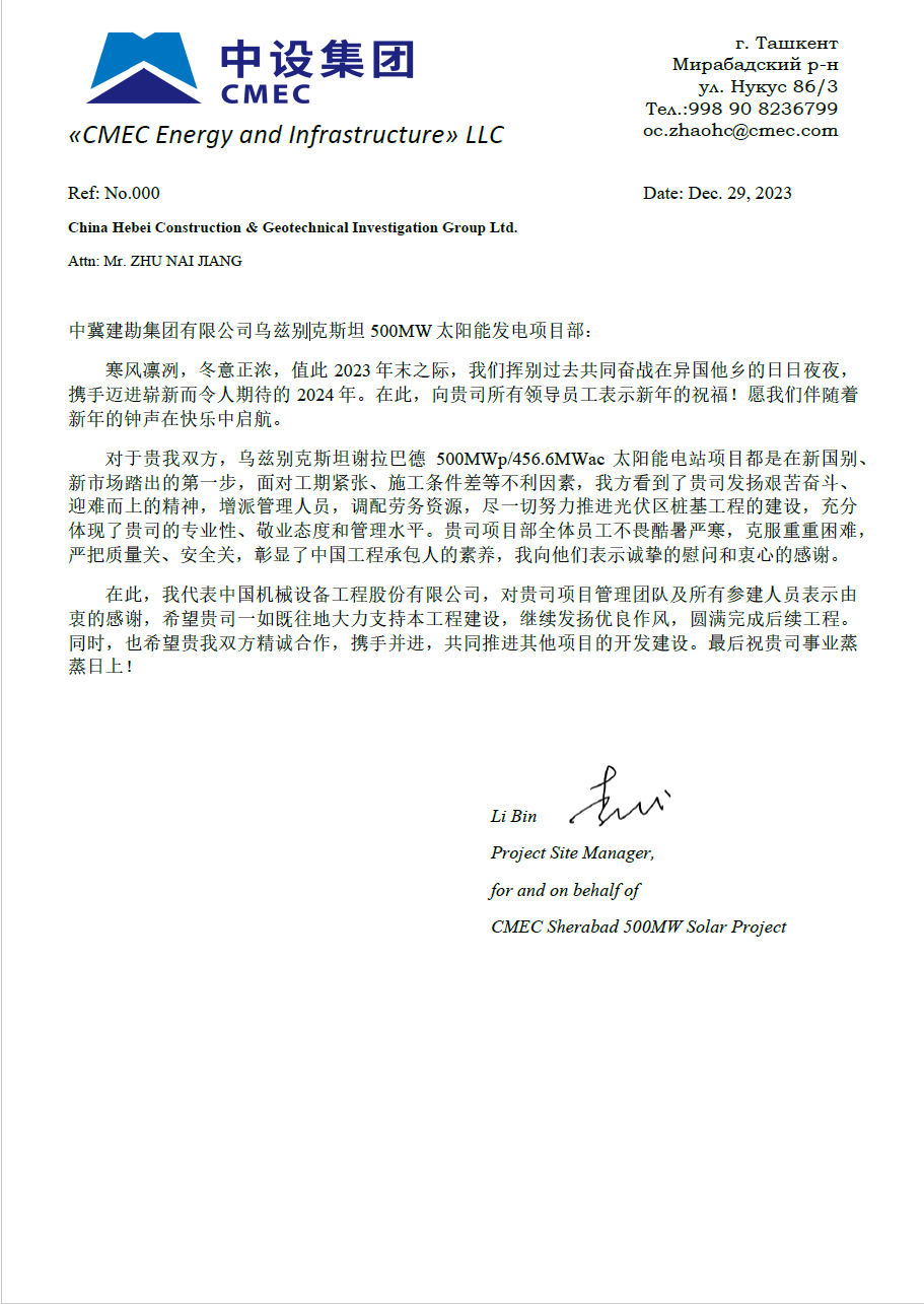 中國機械設備工程股份有限公司發來的表揚信,對在烏茲別克斯坦謝拉巴德 500MWp/456.6MWac 太陽能電站項目建設過程中,項目全體人員克服諸多不利因素,發揚建勘精神,盡一切努力推進工程建設,以及公司的專業性、敬業態度和管理水平給予了高度評價。同時,對項目管理團隊及所有參建人員表示由衷的感謝,并希望雙方精誠合作,攜手并進,共同推進其他項目的開發建設。