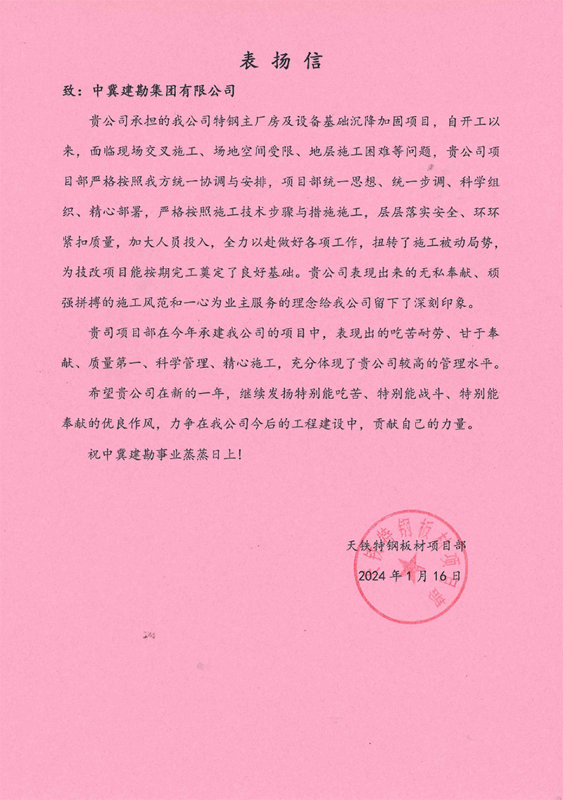 近日,集團公司陸續收到國內外項目業主發來的表揚信,信中對我公司的項目管理、團隊建設、安全文明施工、技術質量管控等,給予了高度評價,同時送上了新年一年的祝福。