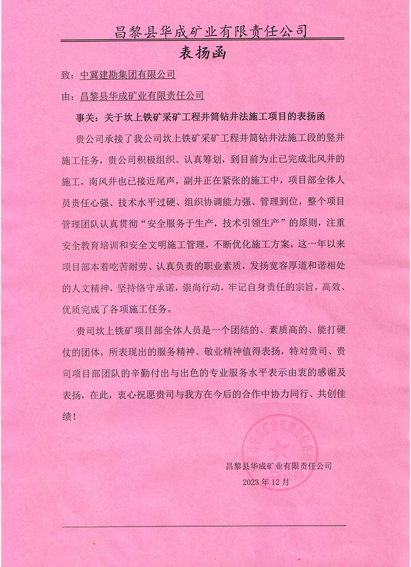 昌黎縣華成礦業有限責任公司發來的表揚函,對我公司在坎上鐵礦采礦工程井筒鉆進法施工項目施工過程中,積極組織,認真籌劃,以及項目部全體人員責任心強、技術水平過硬、組織協調能力強、管理到位,認真貫徹“安全服務于生產,技術引領生產”的原則,不斷優化施工方案,已順利完成北風井的施工,南風井也即將完成,表示由衷的感謝和表揚,希望今后合作中協力同行、共創佳績。