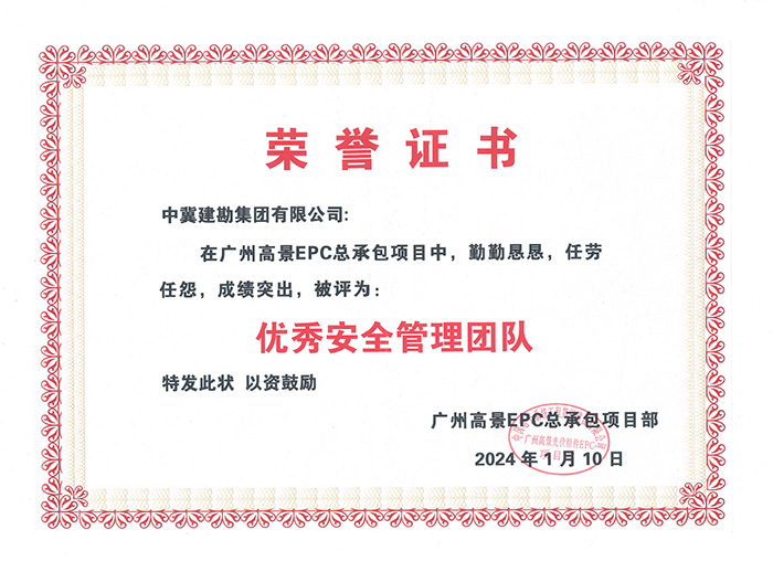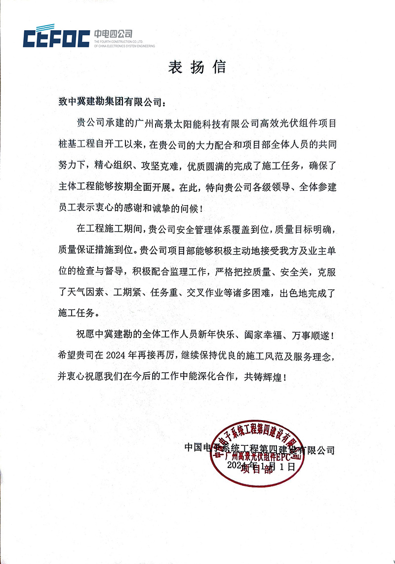中國電子系統工程第四建設有限公司發來的表揚信,對我公司在廣州高景太陽能科技有限公司高效光伏組件項目建設過程中,公司的大力配合和項目部全體人員的共同努力下,安全管理體系覆蓋到位,質量保證措施到位,嚴格把控質量、安全關,出色完成了施工任務,特向我公司各級領導、全體參建員工表示衷心的感謝,并授予“優秀安全管理團隊”和“優秀資料包商”榮譽。