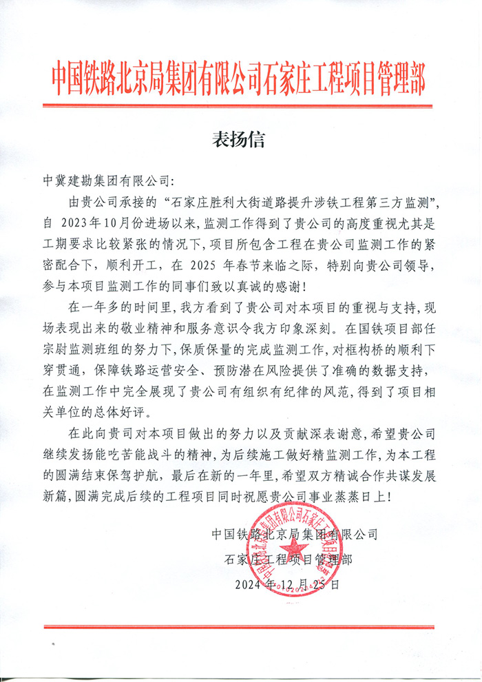 石家莊市勝利大街道路提升涉鐵工程鐵路設施安全監測項目,六公司通過高精度的測繪和實時監測,確保了鐵路設施的安全運營,贏得了中國鐵路北京局的高度評價。京石客專石家莊樞紐改造工程,我們的精準監測工作為工程的順利進行提供了堅實的數據支持,獲得了中鐵六局的高度認可和表揚。