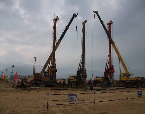 本工程累計完成混凝土灌注樁9761根,完成理論方量多達287000立方,強夯完成30000      平米。其中灌注樁樁徑有1200mm、1000mm、800mm、650mm、600mm五種樁型。大部分為端承樁,部分為摩擦端承樁。圖紙設計主筋直徑有12-28mm不等,混凝土標號為C25-C35不等。