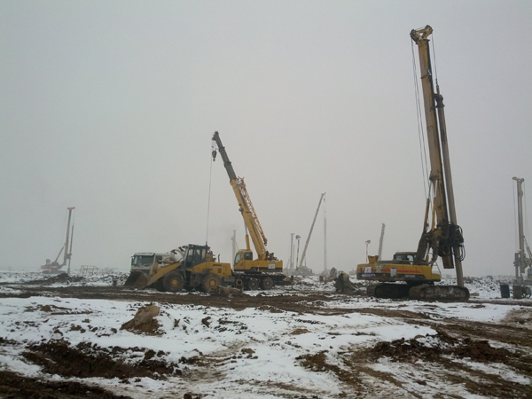本工程采用Ф800㎜、Ф600㎜后壓漿旋挖鉆孔灌注樁、Ф600㎜旋挖鉆孔灌注樁進(jìn)行地基處理。主要工作范圍為:施工區(qū)域?yàn)橹鲝S房A排外道路以西、鍋爐和電袋復(fù)合除塵器之間道路以東、主廠房固定端道路以北、擴(kuò)建端道路以南區(qū)域之間的的全部構(gòu)(建)筑物的樁基工程施工,包括汽機(jī)房框架、汽機(jī)基座、煤倉(cāng)間、鍋爐爐架、電梯井、加熱器平臺(tái)、換熱站及熱網(wǎng)支架、輔助設(shè)備基礎(chǔ)、綜合生產(chǎn)服務(wù)樓、主變區(qū)域、渣倉(cāng)基礎(chǔ)、爐后設(shè)備基礎(chǔ)等建筑物及設(shè)備基礎(chǔ)的樁基施工。主要工作內(nèi)容包括:測(cè)量放線、旋挖成孔、鋼筋籠制作、砼灌注成樁、后壓漿等。